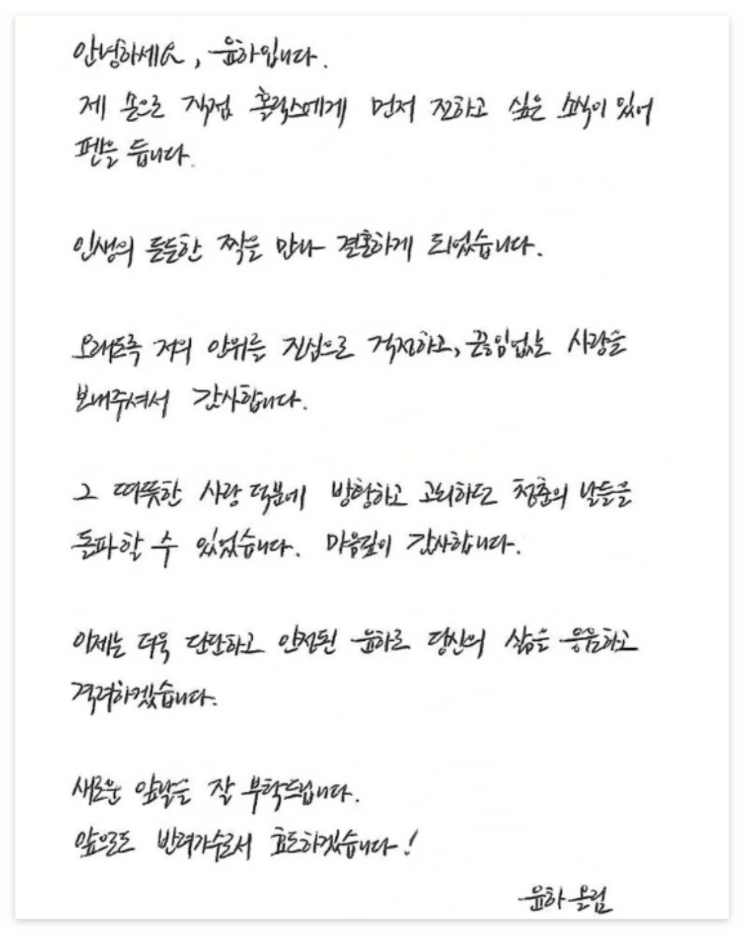 가수 윤하가 직접 쓴 자필 편지에 윤하는 인생의 든든한 짝을 만나 결혼하게 되었다고 밝히며, 오랫동안 자신을 지지하고 사랑해 준 팬들에게 감사의 마음을 전했습니다. 팬들의 사랑 덕분에 어려운 시기를 극복할 수 있었다며 감사 인사를 남겼습니다. 앞으로 더욱 단단하고 안정된 모습으로 팬들의 삶을 응원하고 지켜보겠다고 다짐했습니다. 마지막으로 앞으로도 변함없는 응원과 지지를 부탁하며 최선을 다하겠다는 약속으로 글을 마무리했습니다. 팬들에게 직접 전하는 따뜻한 메시지가 담긴 편지입니다. 💌