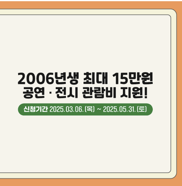 청년문화예술패스는 2006년생 청년들에게 연간 최대 15만 원의 문화예술 관람비를 지원하는 제도로, 공연·전시뿐만 아니라 일부 콘서트와 팬미팅에서도 사용할 수 있습니다. 인터파크와 예스24를 통해 간편하게 신청 및 예매가 가능하므로, 꼭 활용해보세요! 👉 청년문화예술패스 공식 홈페이지